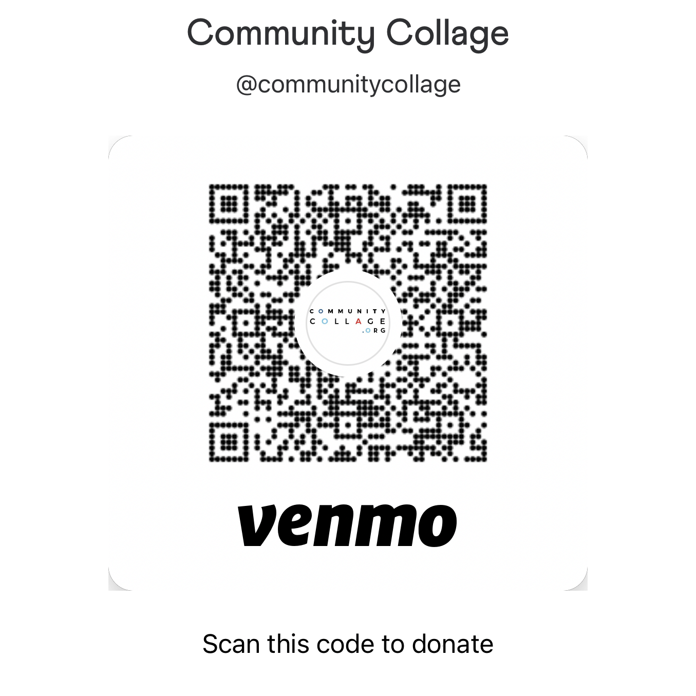 The Community Collage project is expanding. The Community Collage is a 501(c)(3) fiscally managed project. Make a tax deductible contribution by clicking or scanning below. https://www.venmo.com/communitycollage